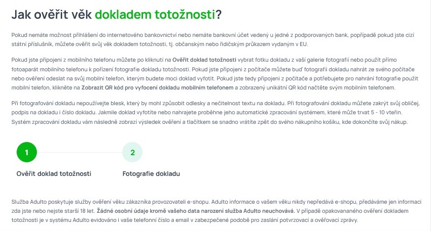 Nemusíte posílat své doklady nezabezpečeným emailem ani je poskytovat internetovým obchodům. Adulto je bezpečným prostředníkem, který o vás neuchovává žádné osobní údaje kromě vašeho data narození. Adulto informace o vašem věku nikdy nepředává e-shopu ve kterém nakupujete, předáváme jen informaci zda jste nebo nejste starší 18 let. V případě použití ověření věku prostřednictvím bankovní identity sdílíte s Adulto jen datum vašeho narození. V případě použití ověření věku dokladem totožnosti není váš doklad uchováván a slouží pouze k procesu jeho ověření v reálném čase.