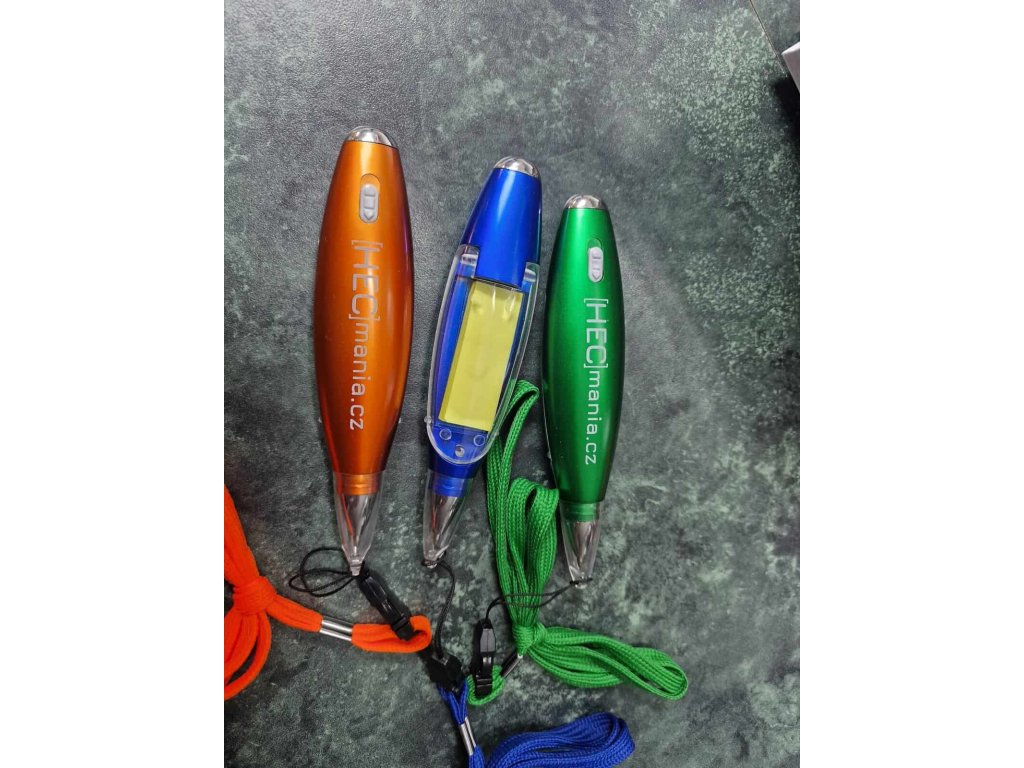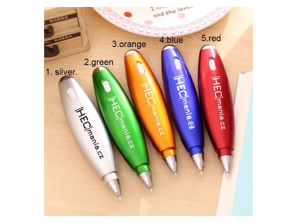 Barva náplně: černá. Elegantní provedení v barvě: oranžová, modrá, zelená, červená, stříbrná. Svítící + mini bloček